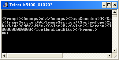 1. コマンドプロンプトを開きます。コマンドプロンプトから、Telnet クライアントを使用してビジョンシステムにログオンします。ログオンするときには、ホスト名または IP アドレスとポート番号 23 (予約済みのネイティブモードコマンドポート) を指定します。例: telnet is5100_010203 23