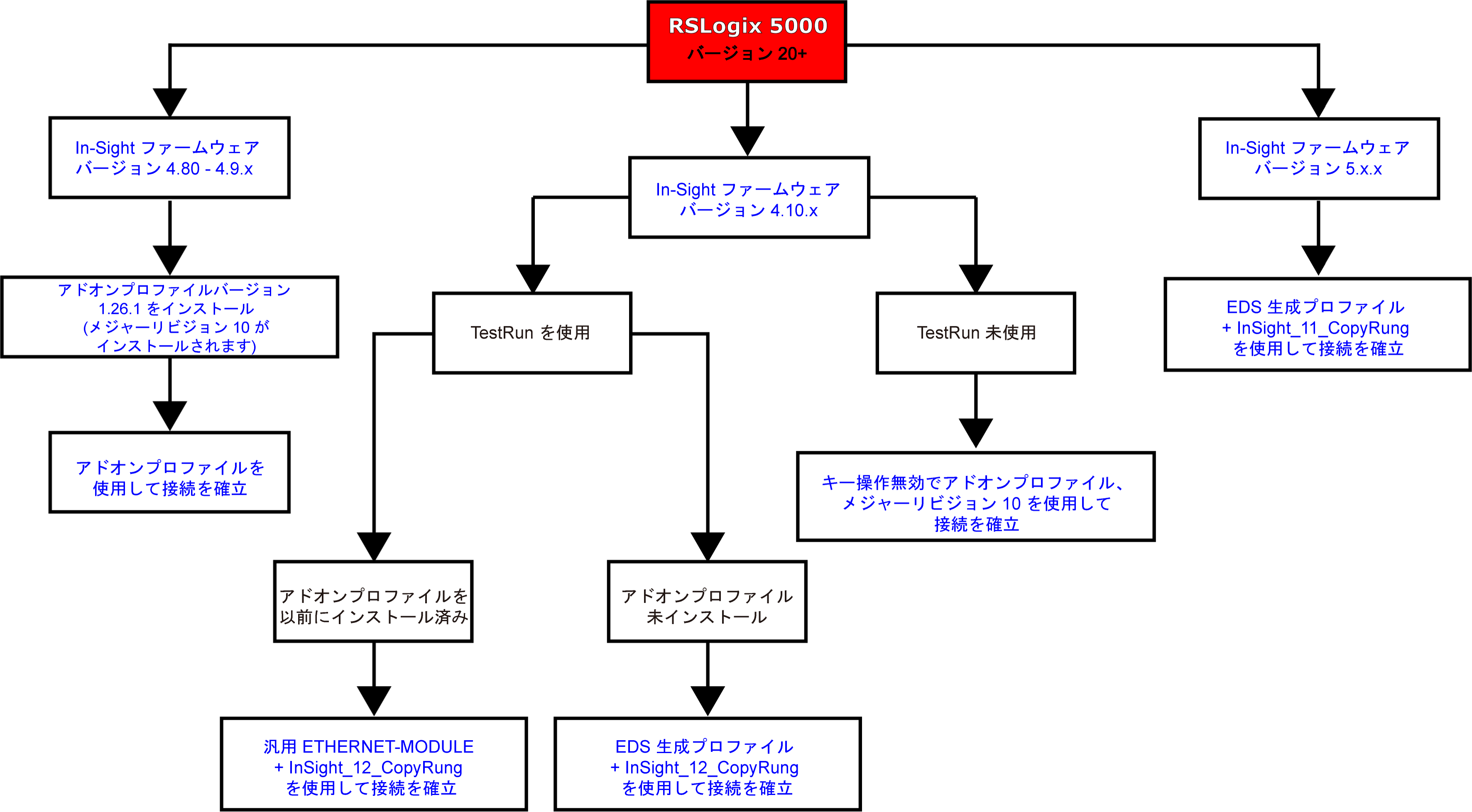 非明示的接続の設定およびデータの送受信手順は、ビジョンシステムにインストールされている In-Sight ファームウェアバージョンと RSLogix 5000 ソフトウェアのバージョンによって異なります。