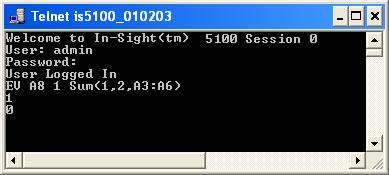 2. Telnet クライアントから In-Sight ビジョンシステムにログオンしているときに、次のコマンドを入力します。EV A8 1 Sum(1,2,A3:A6)