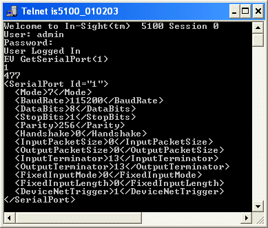 In-Sight センサは、ステータスコード (1) と、その後にバイト単位の文字数 (477) を続けて返して応答します。最後に、[シリアルポートの設定] ダイアログで設定された情報が返されます。