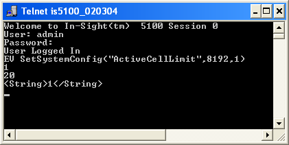 In-Sight ビジョンシステムは、ステータスコード (1) とその後の文字数 (バイト単位、20) で応答します。最後に、制限が設定されたことを示す 1、または制限が設定されていないことを示す 0 のどちらかの結果コードが返されます。変更を有効にするには、In-Sight ビジョンシステムの電源を入れ直す必要があります。