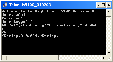 In-Sight ビジョンシステムは、ステータスコード (1) とその後の文字数 (バイト単位、18) で応答します。最後に、[ライブ取り込み] 設定 (1 0.064) が返されます。