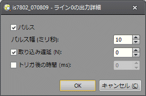 • [トリガ後の時間 (ms)]: このチェックボックスを ON にすると、指定された時間 (0 ~ 10000 ミリ秒) の経過後に、出力が行われます。