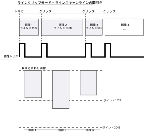 • 2 = ラインスキャンラインの間引き: 現在の画像を現在取り込んだ行数のサイズに縮小し、即座に新しい画像を開始するように指定します