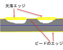 ビードパス沿いに検出されたビードエッジの位置を表示します。エッジが検出されない場合は、黄色の円が表示されて、エッジが検出されると見込まれる場所を示します。