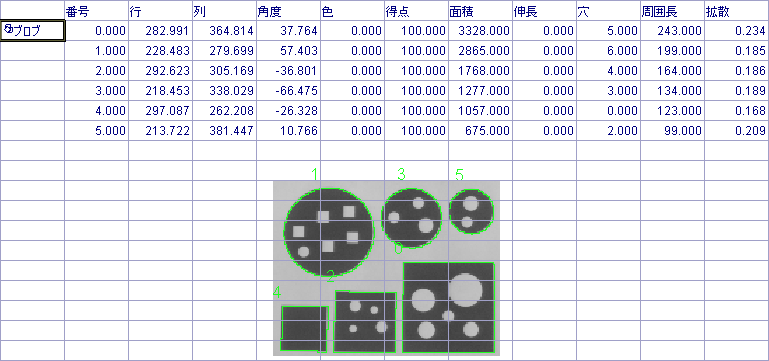 Syntax:DetectBlobs(画像,フィクスチャ.行,フィクスチャ.列,フィクスチャ.角度,領域.X,領域.Y,領域.高さ,領域.幅,領域.角度,領域.カーブ,外部定義領域,ソートする数,しきい値,穴を埋める,境界ブロブ,ブロブの色,背景色,最小面積,最大面積,表示)