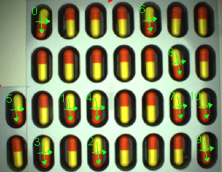 左上のカプセル薬を登録する場合、[照明に対する許容] オプションを有効にしないと、中央近くのカプセル薬は得点が低くなります。このパラメータを有効にすると、得点が増加してより多くのマッチが検出されます。