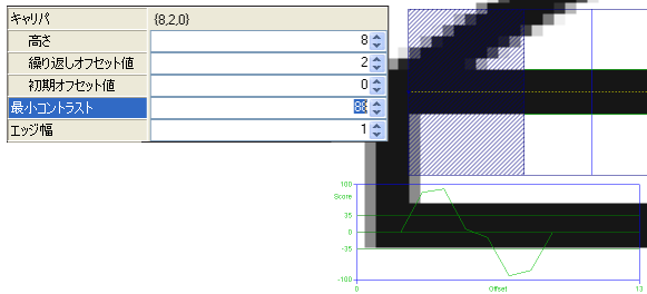 エッジとみなされるグレースケールコントラストの最小変化値を指定します (0 ~ 255、デフォルト = 5)。インデックス付きキャリパごとに、青色で描画されたコントラストグラフが画像上に表示されます。グラフ内の値は、0 ~ 100 の値に自動的にスケール変更されます。このパラメータの適用時にこのグラフを使用すると、値を適切に調整できます。 |