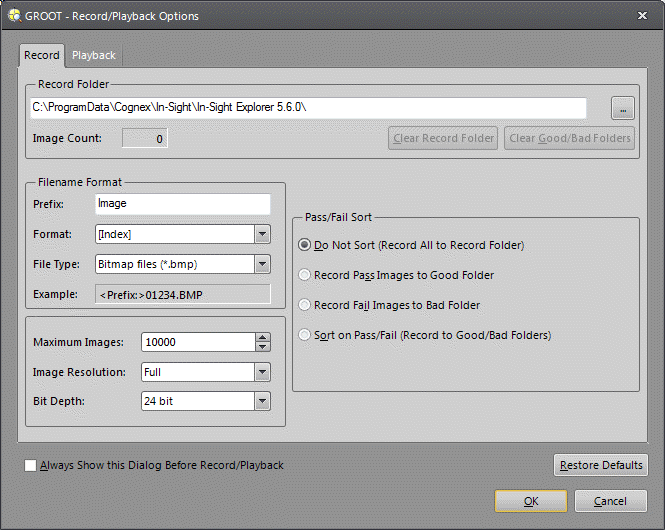 - Always Show this Dialog Before Record/Playback: Select this checkbox to open the Record/Playback Options dialog before recording or playing back images.