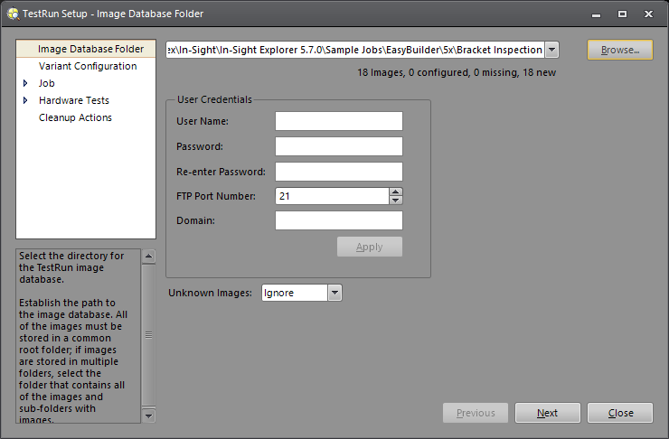 When using TestRun in the EasyBuilder View, the first step of the TestRun Setup dialog is the Image Database Folder screen. The Image Database Folder step will establish a link to the stored images that will be used to construct the tests.