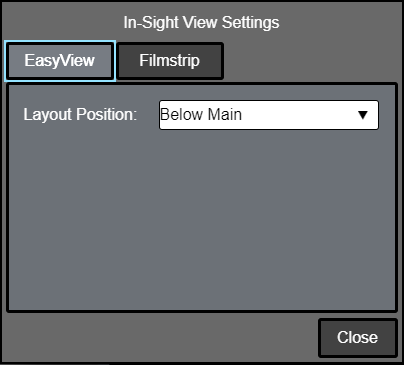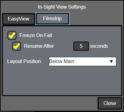 The In-Sight View Settings dialog is used to configure the Web HMI application's layout and the behavior of the filmstrip when the inspection fails.