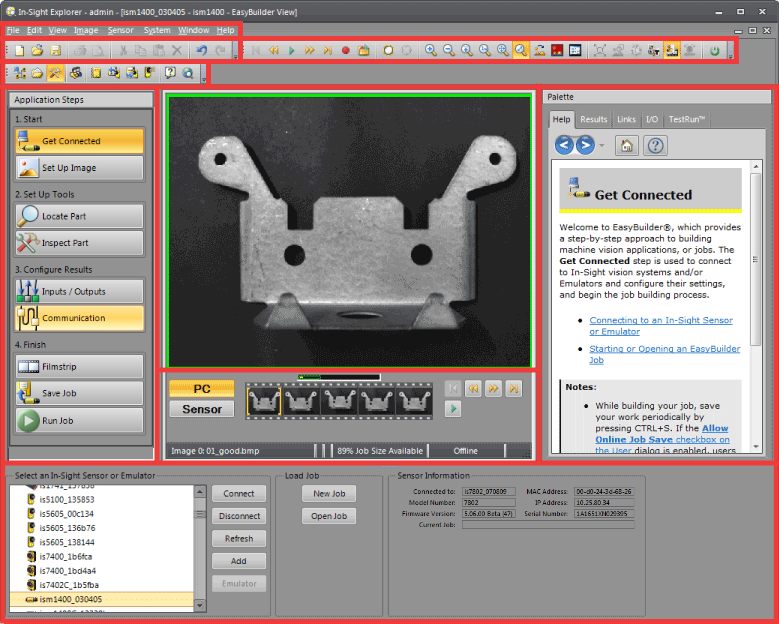 The EasyBuilder graphical user interface (GUI) is centered around the image. The panes and controls surrounding the image are designed to guide you through the process of building a machine vision application (called a job).