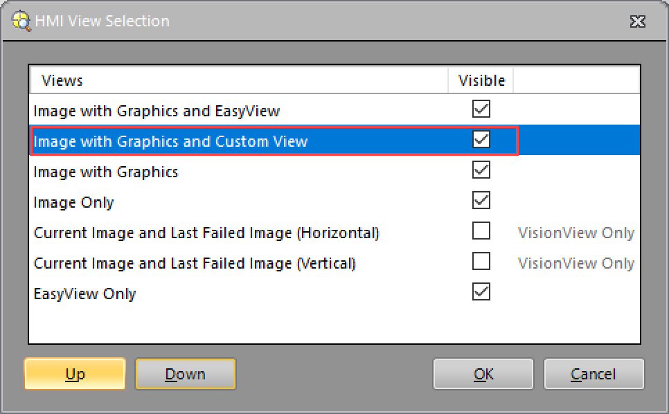(Optional) Select the Image with Graphics and Custom View in the HMI View Selection dialog and click the Up button to move the Image with Graphics and Custom View up in the list. When you open an HMI application, the Custom View is displayed as the default view.