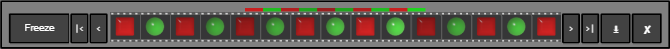 In "frozen" mode, you can navigate through the results in the filmstrip or save images from the vision system to the PC. The stored image and results are loaded to the display. Meanwhile, the job continues to run, but nothing is added to the queue. The filmstrip resumes updating if one of the following occurs:
