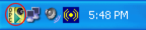 When the In-Sight OPC Classic Server is in its Running state, the system tray icon (encircled in red) includes a green triangle. The green triangle disappears when the server is suspended.