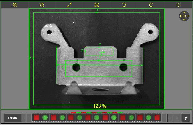 View the updated status graphics in the filmstrip, which represent the pass/fail results. The vision system remains Online, but the filmstrip stops updating and enters "frozen" mode (indicated by a yellow bar at the top of the display area) if any of the following occurs: