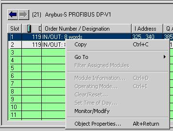In the HW Config Utility, with the Anybus X-gateway selected, right-click the IN/OUT:8 words module, and select Monitor/Modify from the menu.