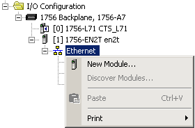 Add a connection to your Ethernet Communications Card. Under the I/O Configuration node, select the Ethernet Node under the Ethernet Module, right-click on the icon and select New Module from the menu.