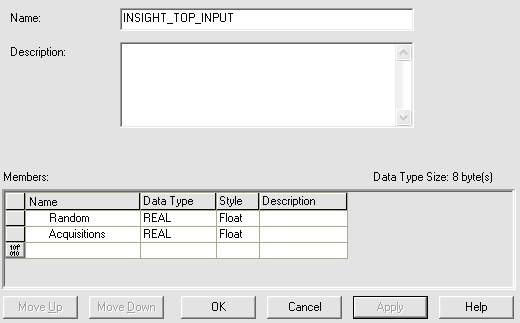 After this program has been downloaded to the ControlLogix PLC, the data from the Random and Acquisition Counter In-Sight Explorer spreadsheet cells will now appear in the InSight_Top_Input tag in the floating point format:
