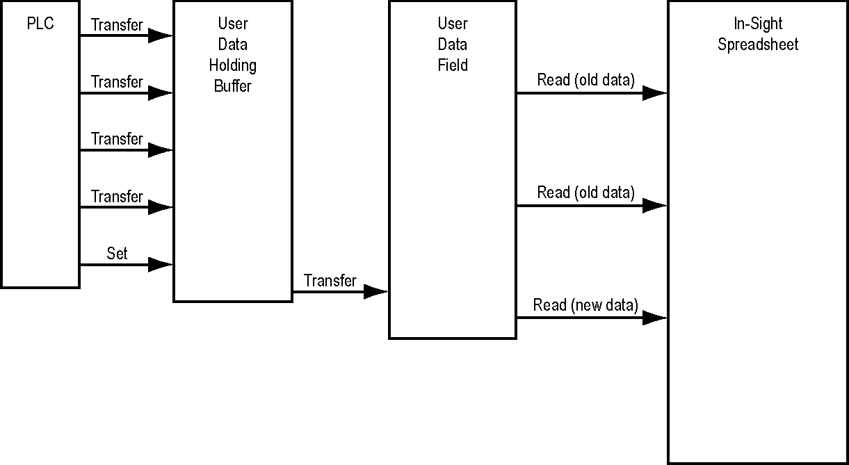 The User Data Holding Buffer is a temporary storage location for user data that is written from a PLC using the Transfer User Data service. This buffer can be used to build up a large data transfer into the vision system, ensuring data integrity during a large transfer. When the Transfer User Data service is executed, the In-Sight Spreadsheet will not be able to read the data until the Set User Data service is executed. Once that service is executed, all transferred data will be accessible to the In-Sight spreadsheet. This mechanism ensures that the In-Sight spreadsheet is always accessing consistent data.