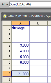 The In-Sight responds with a status code (1) followed by the number of bytes (0) of XML data returned. This evaluate command inserts the formula Sum(1,2,A3:A6) into Cell A8.