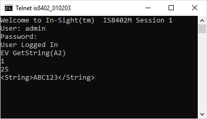 Using a telnet client, log on to the vision system and type EV GetString(A2) as follows: