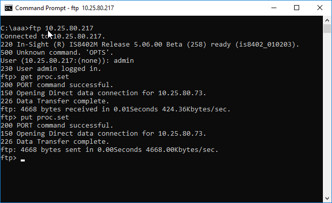 - At the FTP command prompt, type open Address, where Address is the IP address obtained in Step 1. If the connection is successful, a message similar to the following will appear: 220 In-Sight (R) 5100 Release 3.40.00 (2240) ready (is5100_010203).