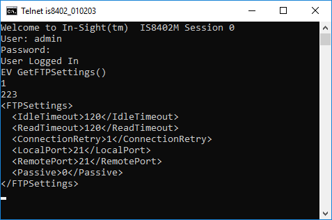 The In-Sight sensor responds with a status code (1), followed by the number of characters, in bytes (223). Finally, the information configured in the FTP Settings dialog is returned.