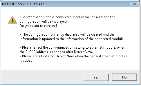 - If the Detect Now button is pressed, and a vision system in the network is not iQSS-compatible, the vision system will not appear in the Ethernet configuration window. If a vision system is iQSS-compatible but no profile was previously added to GX Works, "Module With No Profile Found" will be displayed.