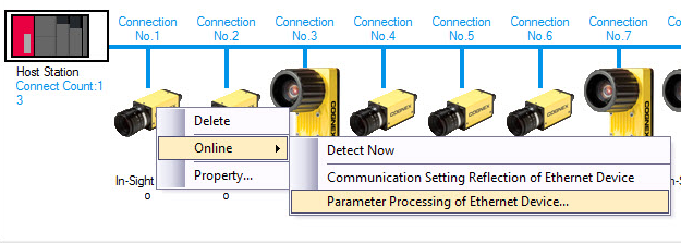 - Select Online --> Communication Setting Reflection of Ethernet Device. The communication settings will be now reflected to the selected vision system.