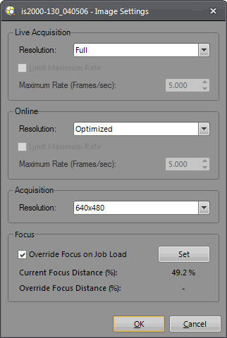 The Image Settings dialog configures the resolution and frame rate of Live Video and Online images and the resolution to use for image acquisition.