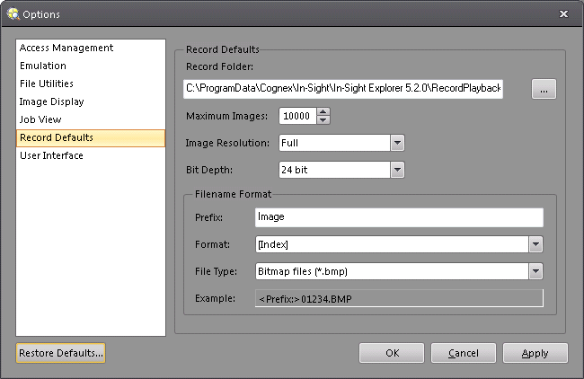 Note: The Record Folder's default location is: C:\ProgramData\Cognex\In-Sight\In-Sight Explorer x.x.x - Maximum Images: The maximum number of images stored in the Record Folder. (1 to 10,000; default = 10,000)