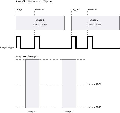 • Set the Trigger type to Camera to clip images properly. With any other Trigger type, if the trigger arrives while an image is being acquired, the current image is not clipped and the trigger is missed.