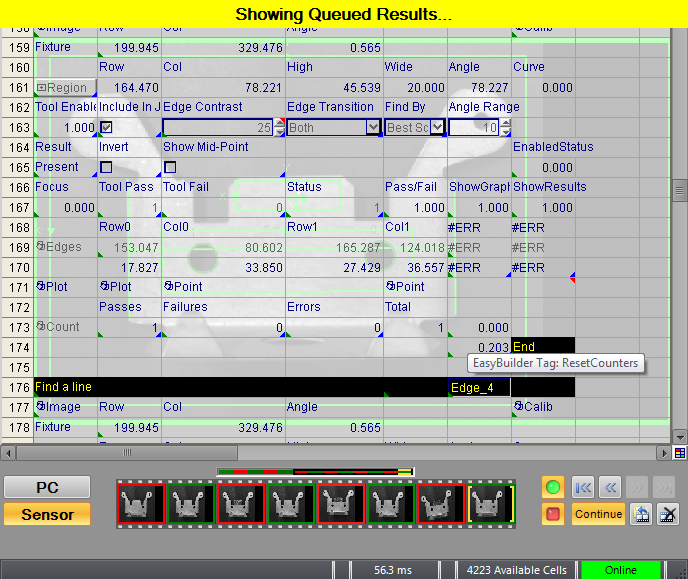 When finished monitoring the results, click the Online button in the toolbar again to place the vision system Offline. When the vision system is placed Offline, no new results are added to the filmstrip. When an existing pass or fail graphic is selected, the stored image and spreadsheet results are loaded to the display and the spreadsheet is read-only. Click the Continue button to return to the standard Offline mode of operation.