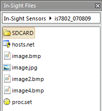 If an SD Card is installed to a vision system, the SD Card folder is displayed in the In-Sight File pane. The SD Card supports jobs/images (Save and Open dialog) and cell data (Export/Import Cells dialog, ExportData and ImportData functions).