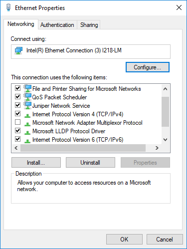 - In the This connection uses the following items portion of the dialog, enable either the Internet Protocol Version 4 (TCP/IPv4) checkbox or the Internet Protocol Version 6 (TCP/IPv6) checkbox.