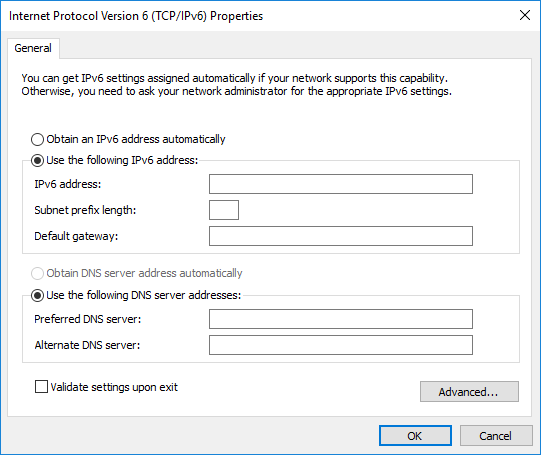 Internet Protocol Version 6 (TCP/IPv6) Properties: Click the Use the following IPv6 address radio button. The IPv6 address, Subnet prefix length and Default gateway fields, which are greyed-out, become active.