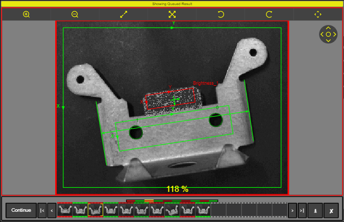 4. When finished monitoring the results, click the Offline button to place the vision system Offline. When the vision system is placed Offline, no new results are added to the filmstrip. When an existing pass or fail graphic is selected, the stored image and results are loaded to the display. Click the Continue button to return to the standard Offline mode of operation.