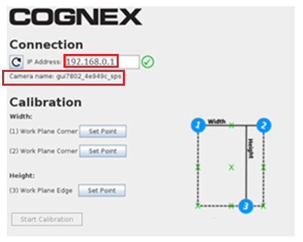 Si aparece este error: Haga lo siguiente: Asegúrese de que la cámara esté en línea y de que se haya cargado el archivo de tarea adecuado. En In-Sight Explorer, compruebe que la cámara esté en línea. El formato de la dirección IP no es válido (ejemplo de dirección: 192.168.0.1) En el software del robot, compruebe que se haya introducido la dirección IP correcta para esa cámara. Se ha agotado el tiempo de espera. Asegúrese de que el adaptador de red esté habilitado en Configurar red de robot. En el software del robot, compruebe que el robot esté en la red correcta. - Determine y tome nota visualmente del plano de trabajo que incluirá la parte que cogerá el robot. El siguiente gráfico ilustra los puntos de muestra de anchura y altura. Note: En los pasos 4 a 6 siguientes, antes de hacer clic en Aceptar, podrá verificar que el sistema de visión aún puede ver el PCH disparando una imagen manualmente en In-Sight EasyBuilder.