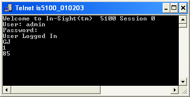 In-Sight センサは、1 で応答して、コマンドが正常に実行されたことを示します。アクティブジョブの名前は、「85.JOB」です。