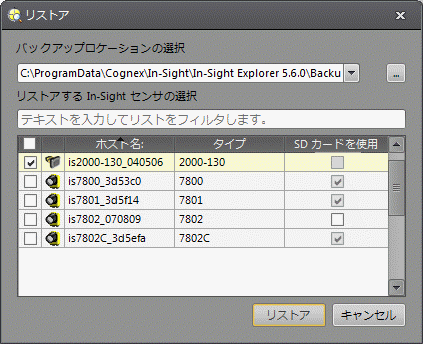 • アーカイブされたビジョンシステム/センサの最新のバックアップのみが [リストア] ダイアログのリストに表示されます。古いバックアップからリストアする場合、または別のビジョンシステム/センサからのバックアップをリストアする場合は、代わりに [選択してリストア] ダイアログを使用します。