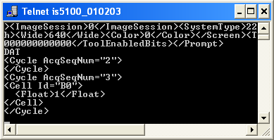 7. In-Sight ビジョンシステムで画像を一度取り込みます。2 番目の Telnet プログラムが受信したデータが表示されます。