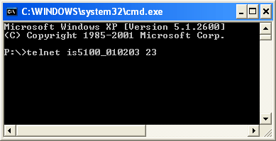 1. コマンドプロンプトを開きます。コマンドプロンプトから、Telnet クライアントを使用してビジョンシステムにログオンします。ログオンするときには、ホスト名または IP アドレスとポート番号 23 (予約済みのネイティブモードコマンドポート) を指定します。例: telnet is5100_010203 23