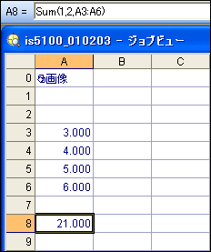 In-Sight は、ステータスコード (1) と、その後に XML データのバイト数 (0) を続けて返して応答します。この Evaluate コマンドにより、数式 Sum(1,2,A3:A6) がセル A8 に挿入されます。