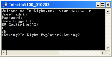 2. 次のように、Telnet クライアントを使用して In-Sight ビジョンシステムにログオンし、EV GetString(A2) と入力します。