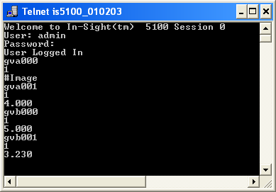 Get Value Native Mode コマンドを使用して In-Sight ビジョンシステムからデータ文字列を取得する必要があります。次の telnet クライアントウィンドウに示すように、コマンド GVJob.Robot.FormatString を発行します。
