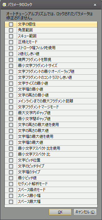 [パラメータのロック]: [パラメータのロック] ダイアログを起動します。このダイアログでは、[オートチューン] ダイアログで最適なセグメンテーションパラメータ (オートチューンプロセスの開始前に設定します) を計算するときに変更しない OCRMax パラメータを指定します。
