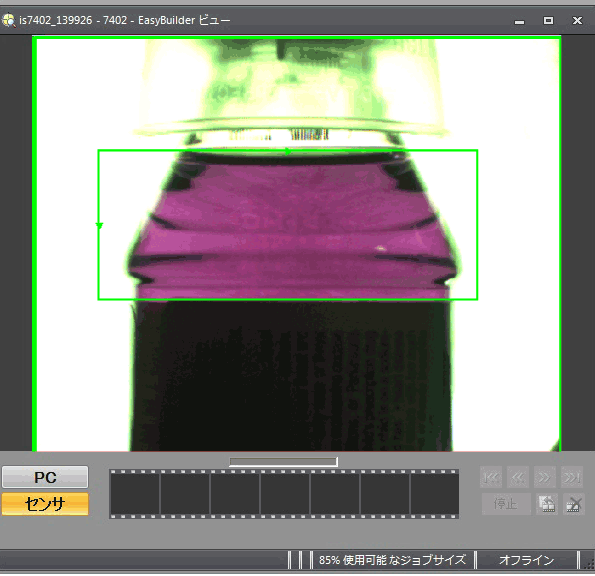 - ステータスバー: 割り当てられたサイズの割合 (%) としての現在使用可能なジョブサイズ (この値を変更するには [ジョブサイズ制限] ダイアログを使用します) と、アクティブな In-Sight ビジョンシステムのオンライン/オフラインステータスを示します。