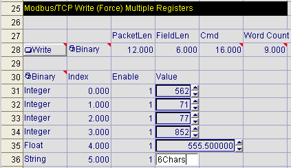 次に、アプリケーションに対する正しいデータタイプになるように、セル D30 ~ D34 の値を調整します。セル D31 ~ D34 に格納されている 3 つの整数について、EditInt セルに値を入力します (値は、範囲が -32768 ~ 32767 で、この範囲内の有効な整数である必要があります)。セル D35 には浮動小数点値 (値は、範囲が ±1.175495e-38 ~ ±3.402823e+38 で、この範囲内の有効な浮動小数点値である必要があります) を入力し、セル D36 には 6 バイトの文字列 (文字列の長さは 6 文字/バイト以下) を入力します。