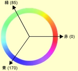 色相を数値に変換する処理は、色相環を作ることで行われます。色相環では、スペクトルのすべての色相が環状に配置されます。特定の色相は、その色相が色相環に配置される角度を割り当てることで指定されます。次の図に、色相環を示します。